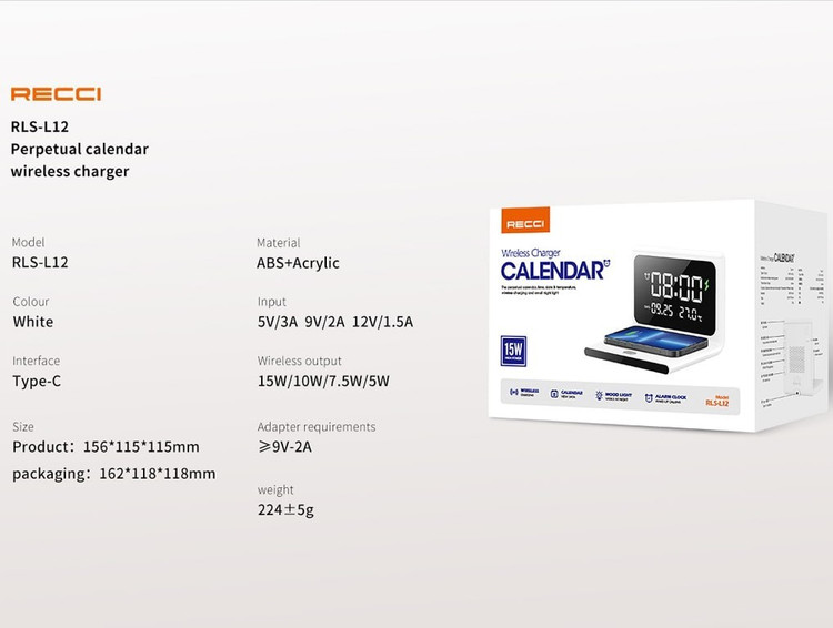 شارژر بی سیم رسی مدل RLS-L12 با ساعت و تقویم ۱۵ وات
